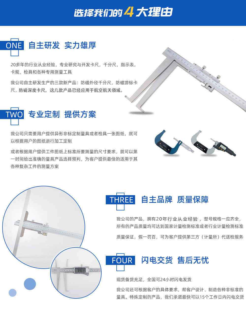 天津桂量量具刃具有限公司,擁有20年的行業(yè)從業(yè)經(jīng)驗(yàn),主要生產(chǎn)游標(biāo)卡尺卡尺,數(shù)顯卡尺,帶表卡尺,各種千分尺,百分表,內(nèi)徑百分表,高度游標(biāo)卡尺,深度卡尺,卡規(guī),檢具和各種測量工具,是一家集設(shè)計生產(chǎn),銷售為一體的企業(yè)。 我公司開發(fā)生產(chǎn)了三款新產(chǎn)品:防磁外徑千分尺,防磁游標(biāo)卡尺,防磁深度卡尺,這幾…